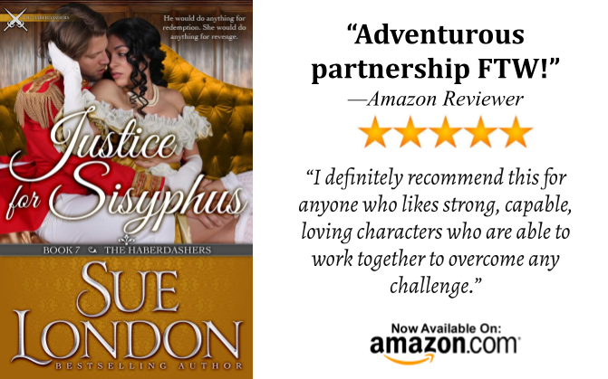 Today the seventh book in the Haberdashers series, Justice for Sisyphus, hits the virtual shelves. We know the hero, because he’s the steward of Kellington from the first book. Trials of Artemis. You remember, the steward who was fired for hiding smuggling from the earl. Oops.